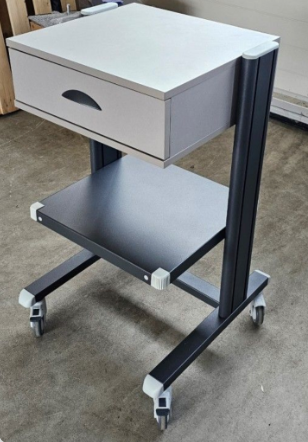 Carrello per supporto dispositivi medici con cassetto in laminato plastico, colonne in alluminio, ripiano in acciaio verniciato, base in tubolare, ruote diametro 80mm.